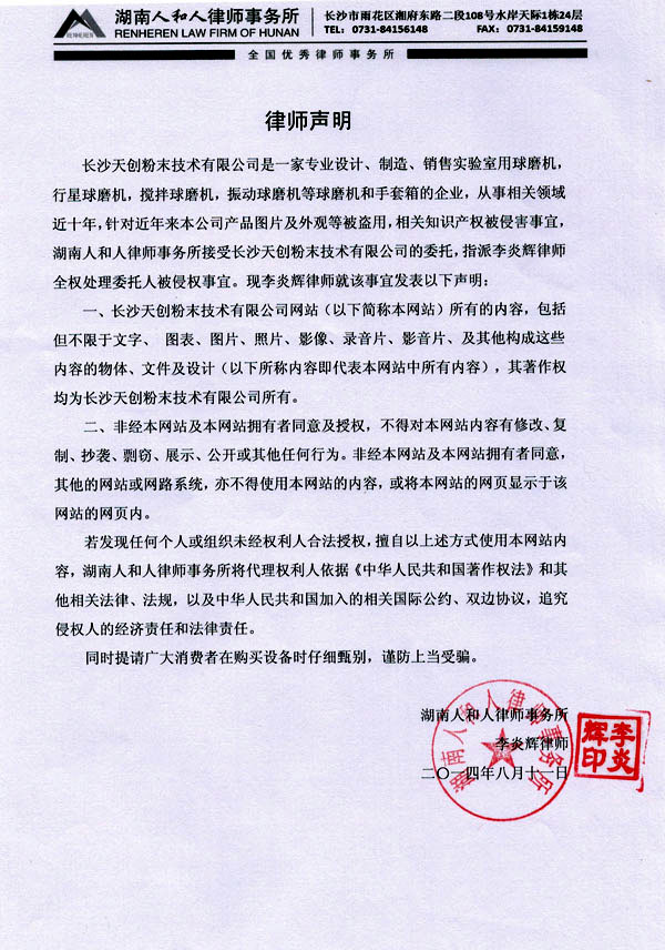 長沙天創粉末技術有限公司強烈譴責這種欺騙消費者的違法行為,并正在積極采取維權措施,追究侵權者的法律責任,制止這種侵權和欺騙消費者的行為。望廣大消費者認準正牌廠家,以免上當受騙。